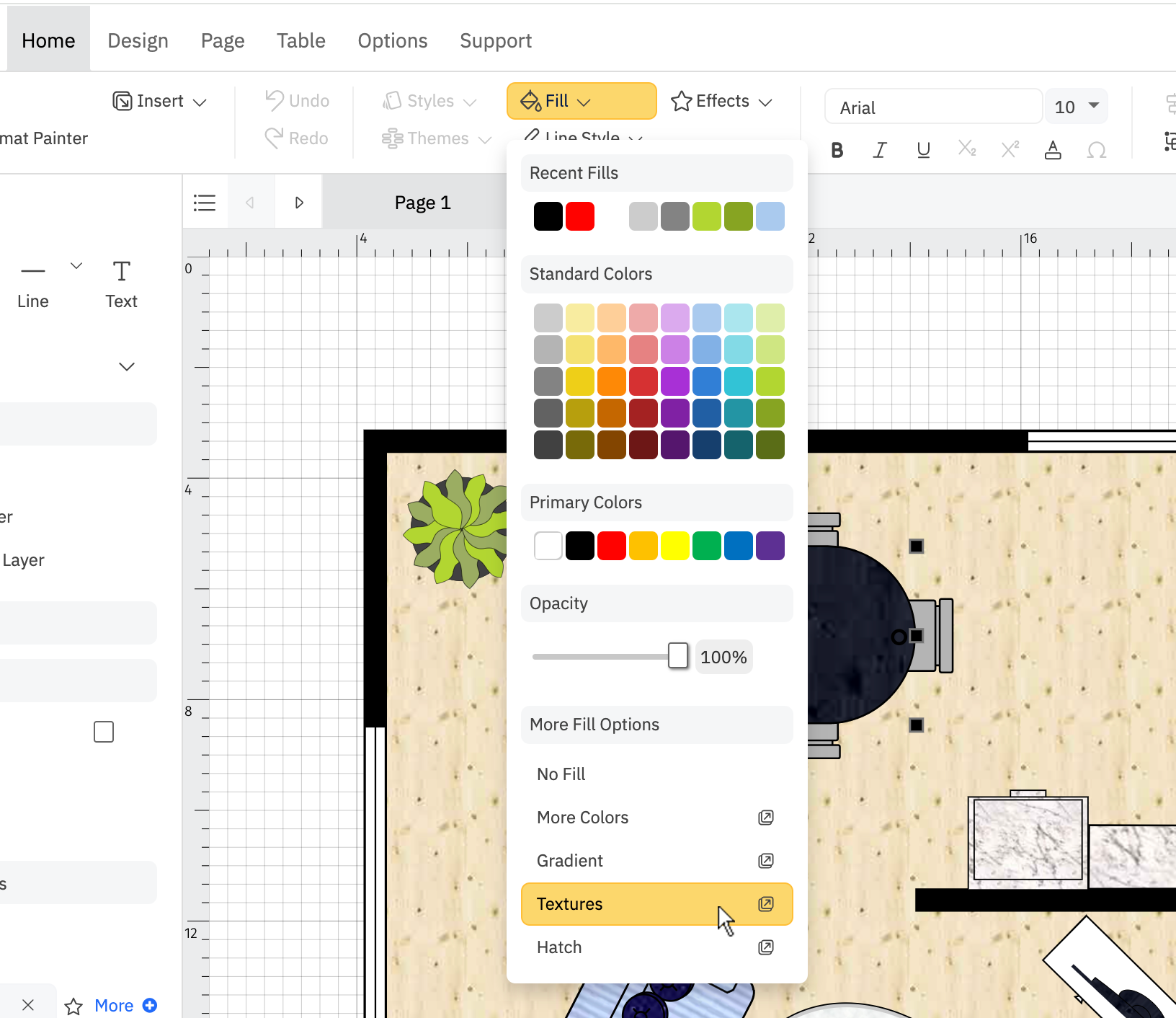 To apply a texture fill to a shape, select the Textures option from the Fill menu under the Home tab.
